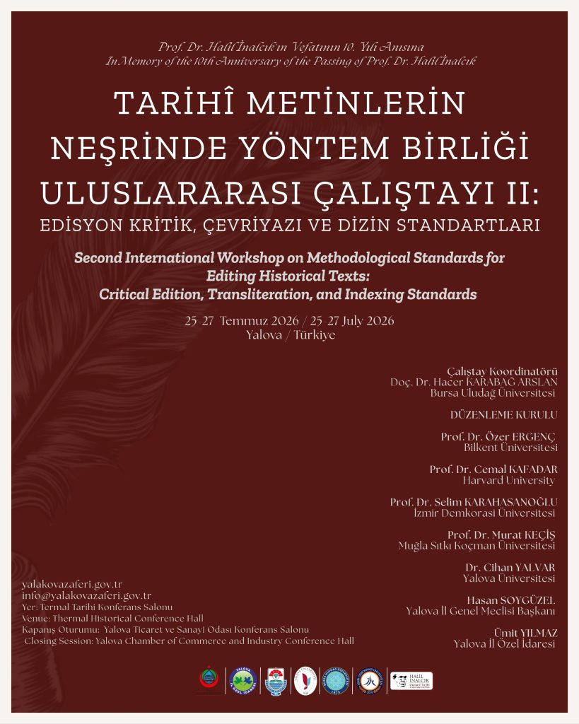 Osmanlı tarihçiliği ve Türkoloji çalışmalarında bilimsel kaynak yayıncılığının evrensel standartlarını belirlemek, sahadaki metodolojik dağınıklığı gidermek ve disiplinler arası bir uygulama birliği sağlamak amacıyla başlatılan uzun soluklu projenin ikinci ve teknik uygulama ayağı olan “Tarihî Metinlerin Neşrinde Yöntem Birliği Uluslararası Çalıştayı II”, 25-27 Temmuz 2026 tarihlerinde Yalova’da gerçekleştirilecektir.